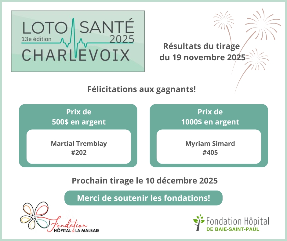Loto Santé Charlevoix est une activité conjointe entre la Fondation de l’Hôpital de Baie-Saint-Paul et la Fondation de l'Hôpital de La Malbaie.